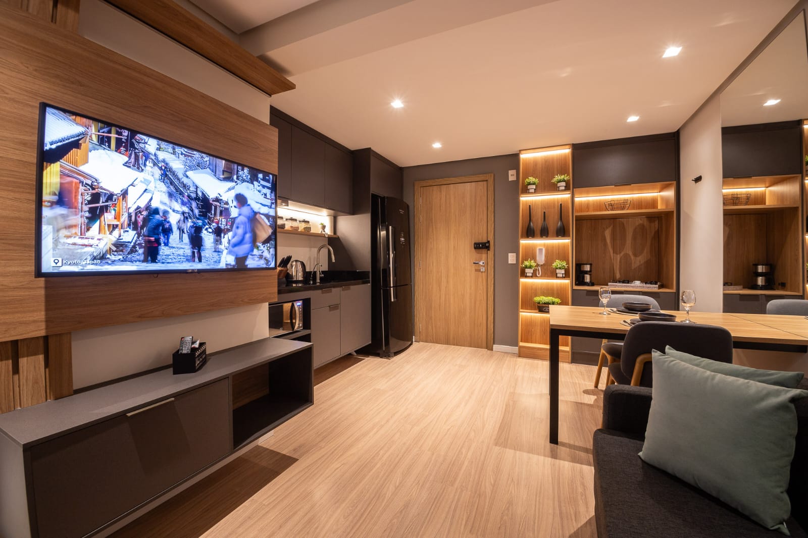 O studio 410 tem cara de casa, pensado e projetado com muito carinho e atenção, disponibiliza todas as comodidades para que os hóspedes sintam-se muito confortáveis. Ao passarmos pela porta de entrada onde o acesso é por fechadura eletrônica, nos deparamos com espaços integrados de muito bom gosto. A cozinha é completa, onde o hóspede pode preparar suas refeições com facilidade. Na sala de estar contamos com sofá bastante confortável e smart tv. A área do quarto possui ampla janela que recebe toda a luz natural do sol da manhã, para quem prefere o escuro, basta fechar as persianas, elas são black-out. Também na área do quarto, temos um espaço exclusivo para home office com vista para o jardim e rua que dá acesso ao parque. Nosso espaço é adequado para até dois hóspedes, pets são bem-vindos. O loft 410 fica localizado no andar onde se dá o acesso ao espaço das churrasqueiras, sala de reunião e coworking. Taxa de limpeza: R$ 80,00.